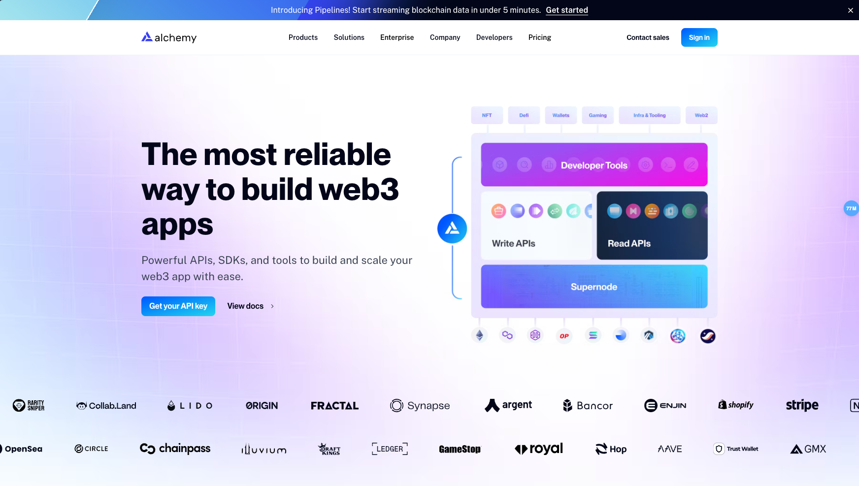 Alchemy is a highly capable Ethereum API that provides developers with the tools they need to build, scale, and operate blockchain applications more efficiently. By offering a suite of developer tools that enhance and simplify the blockchain development process, Alchemy powers millions of users and billions of blockchain queries. - Key Strengths: