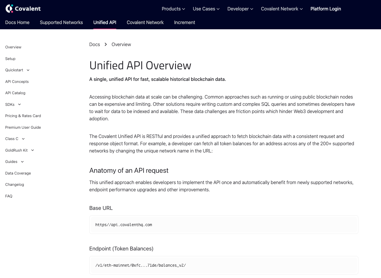 - Overview and Key Features: Covalent provides a unified API bringing visibility to billions of blockchain data points. It aggregates information from multiple blockchains into one easy-to-use interface, facilitating data extraction and analysis without the need for code.